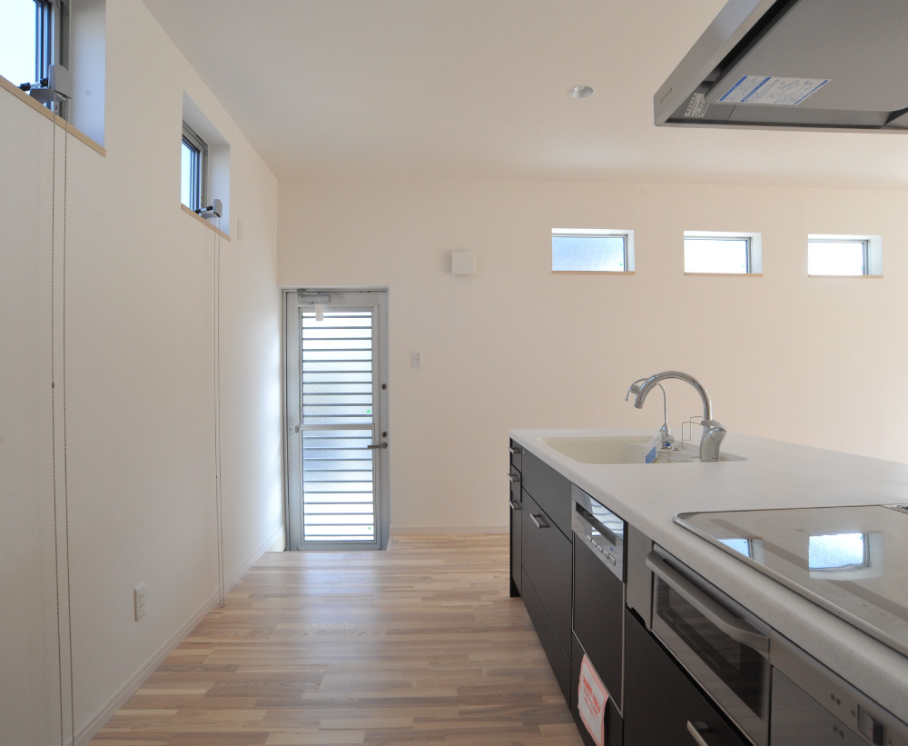 琵琶湖の夏風や太陽の位置を生かしたプランで、側面(壁)の高い位置に窓を設け、プライバシーや外観のデザインにも配慮しながら部屋の奥まで光を取り入れています。